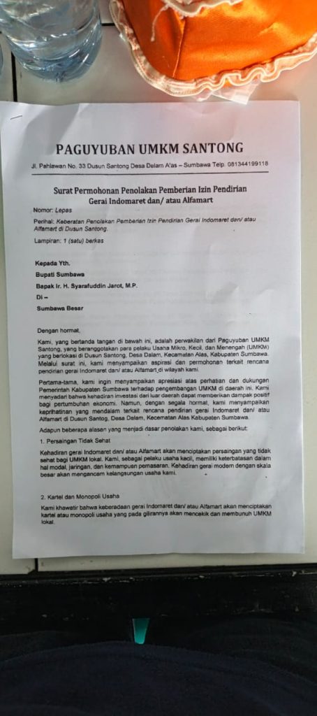 Dedi Raharjo, Salah Satu Warga setempat saat ditemui anugerah-media.com, jum”at ( 28/11) menjelaskan, bahwa penolakan secara tertulis telah disampaikan kepada Bupati Sumbawa tertanggal 25 November 2025 oleh panguyuban UMKM Prihal penolakan pemberian izin Pendirian gerai indomaret dan /atau Alfamart di wilayah setempat ( Santong Red) dirinya menilai bahwa toko retail di wilayah kecamatan Alas cukup menjamur padahal wilayahnya kecil tapi toko retail lumayan banyak lantas UMKM lokal seperti kios dan toko milik warga setempat tentu sangat terhimpit dengan investor besar.